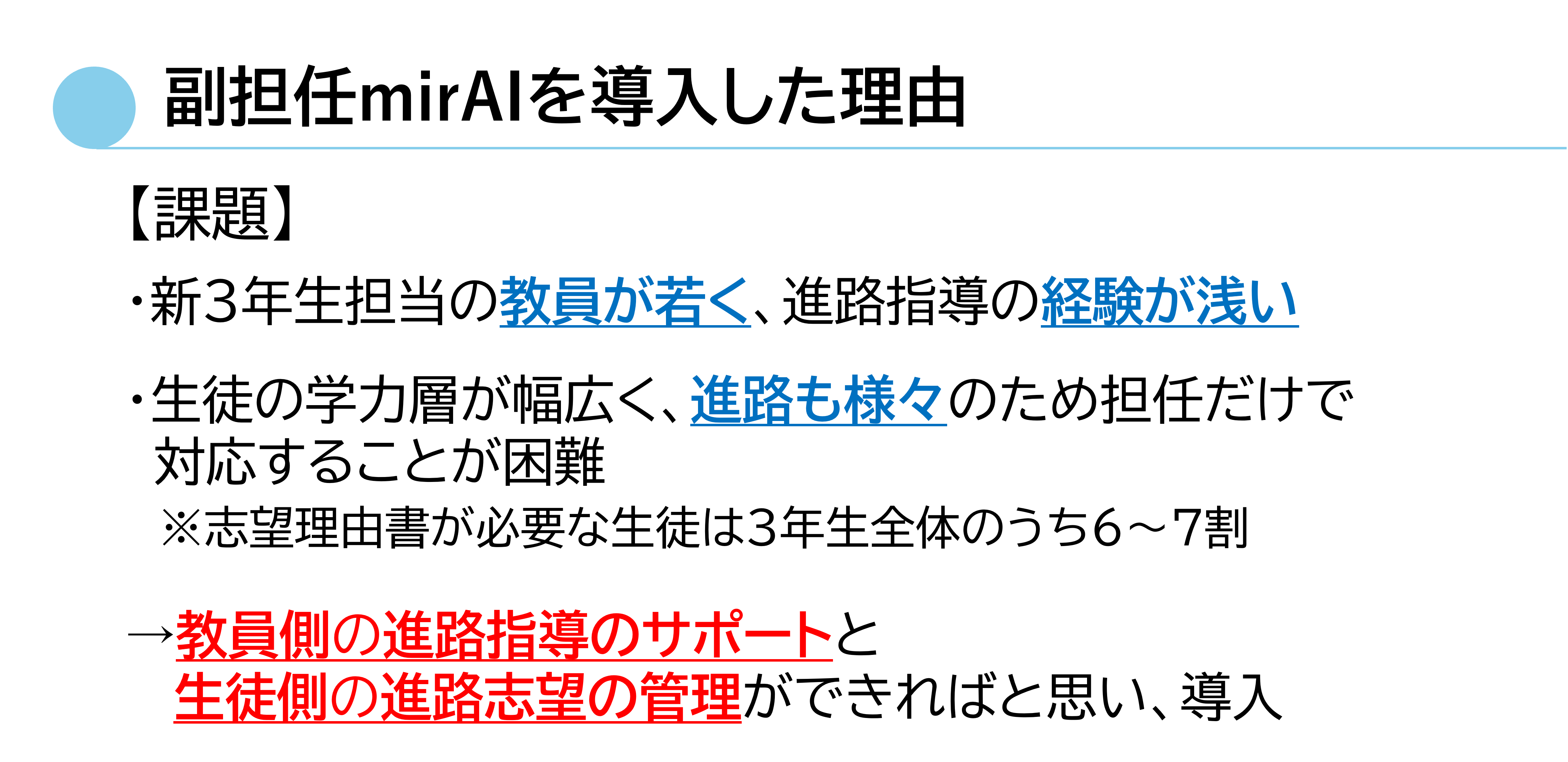 また本校の生徒の学力は幅があり、進学を目指す生徒の志望校のレベルも様々です。学年の約6~7割の生徒が志望理由書を必要としている現状で、一人にかけられる指導時間は限られています。業務負担の軽減や効率の良い指導を行うため、副担任mirAIを導入しました。