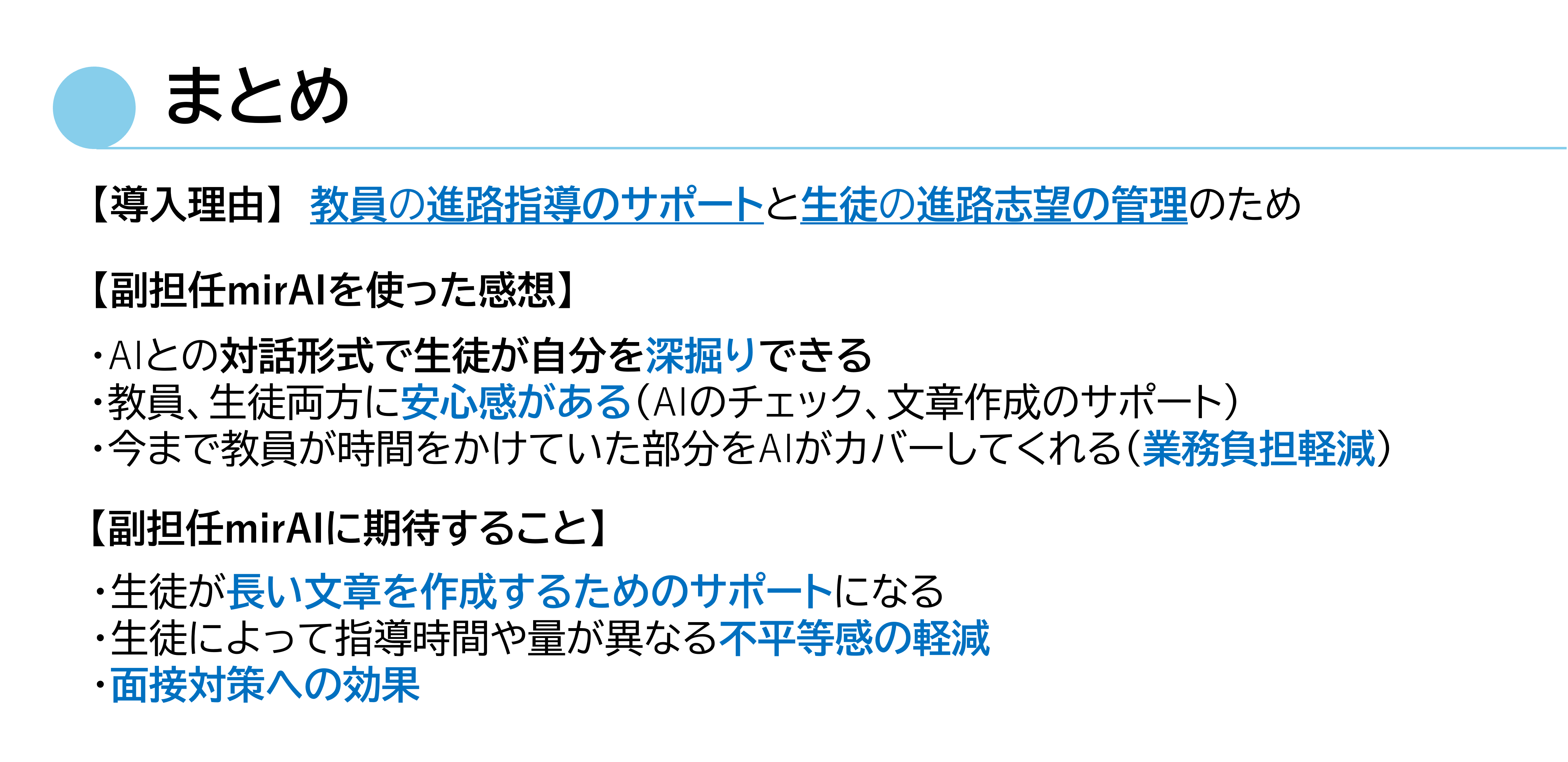 H先生:一人あたりの指導にかけられる時間も制限がある中で、副担任mirAIが生徒のサポートになると感じました。また、複数の生徒に同じような指導をそれぞれにしている現状において、副担任mirAIのサポートがあれば一気に初期段階を進められると思います。