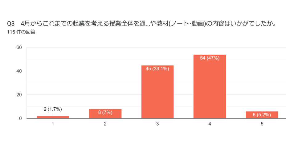 授業を進めていく中で、商品やサービスのターゲットを考えるフェーズに入ると、生徒たちから「こんなお店をやってみたい」といったアイデアが沸いてきて、とても楽しんで取り組んでいる様子が見られました。MyBiz編の授業の後、生徒にアンケートを実施した結果、満足度では5段階評価中4が47%で最も多かったです(※以下グラフ参照)。評価5は5.2%ではありましたが、半数以上の生徒が興味を持ったことがわかりました。このようにプログラムを通じて、起業することに対する生徒の興味関心を引き出せた点が良かったと感じています。