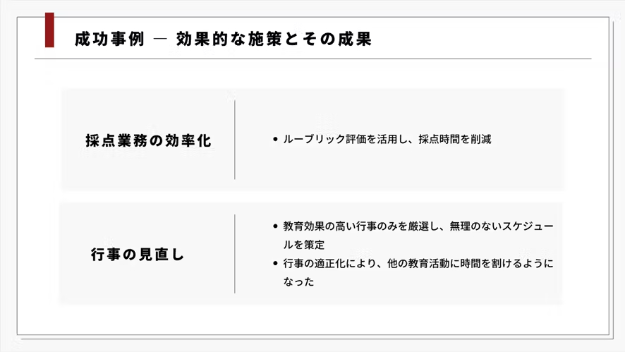 この取り組みにより、教員の負担が軽減されるだけでなく、生徒にとってもより価値のある学びの機会が提供されるようになりました。