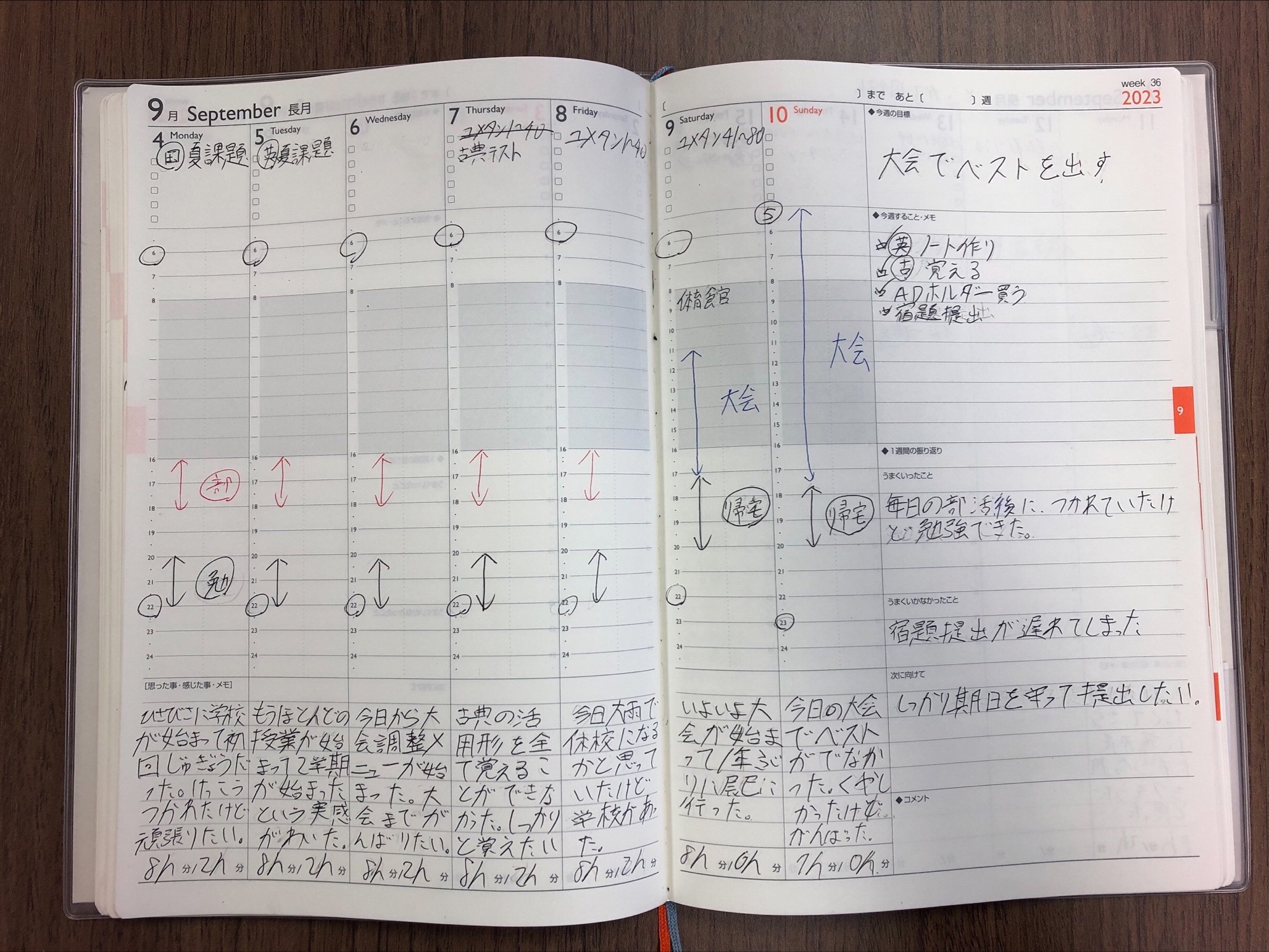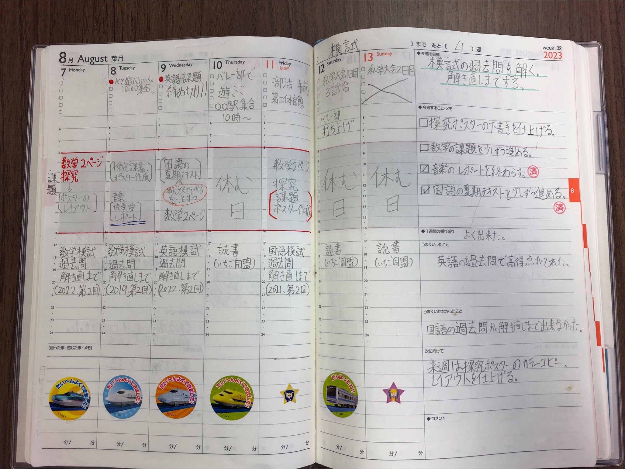 Nさん:手帳に予定を書くことが勉強と紐づいてしまうことに苦手意識があったように思います。予定=宿題になるからです。正直、机に向かうのも面倒でしたが、手帳を書き始めてから勉強時間は増えたと思います。