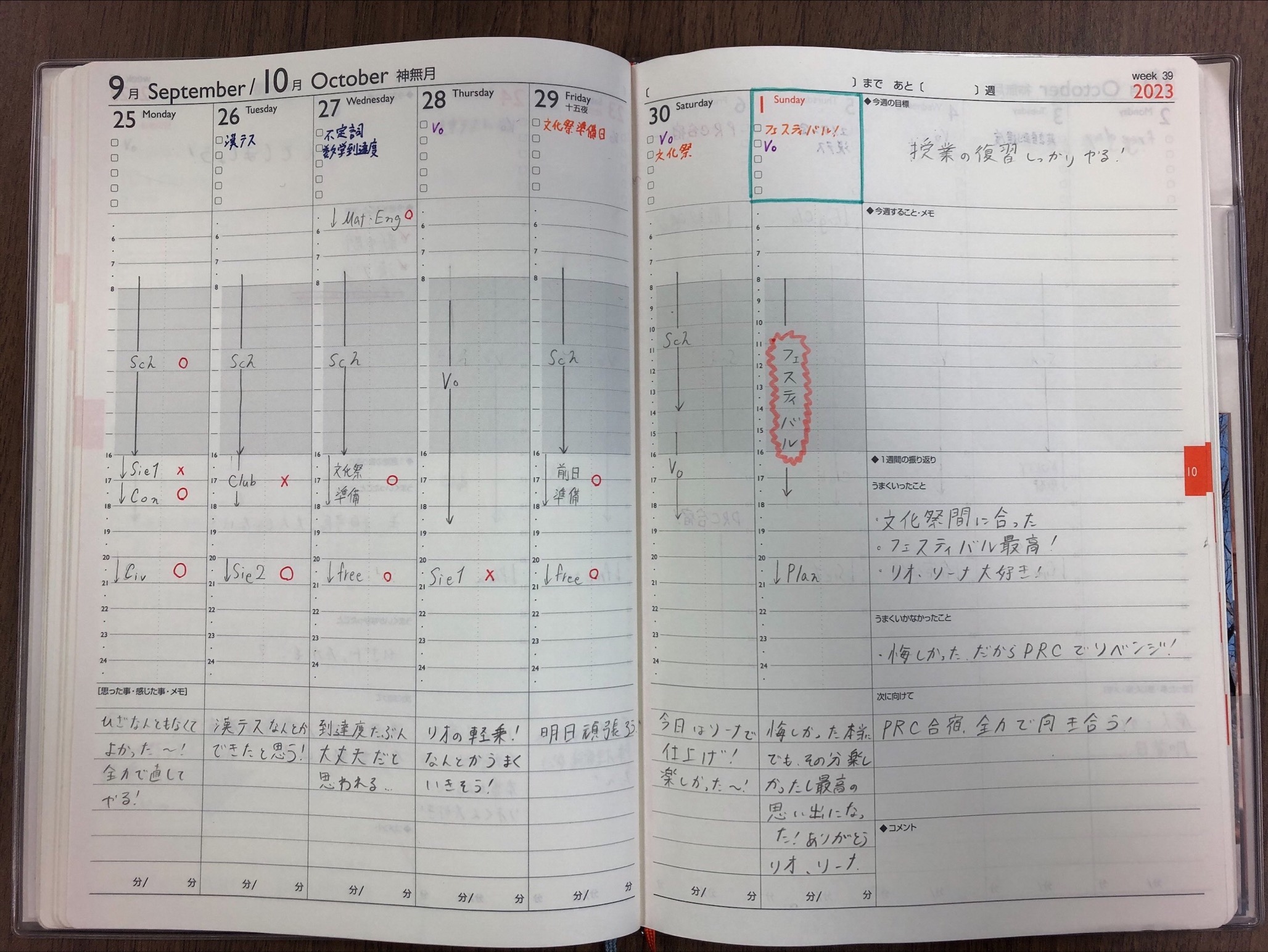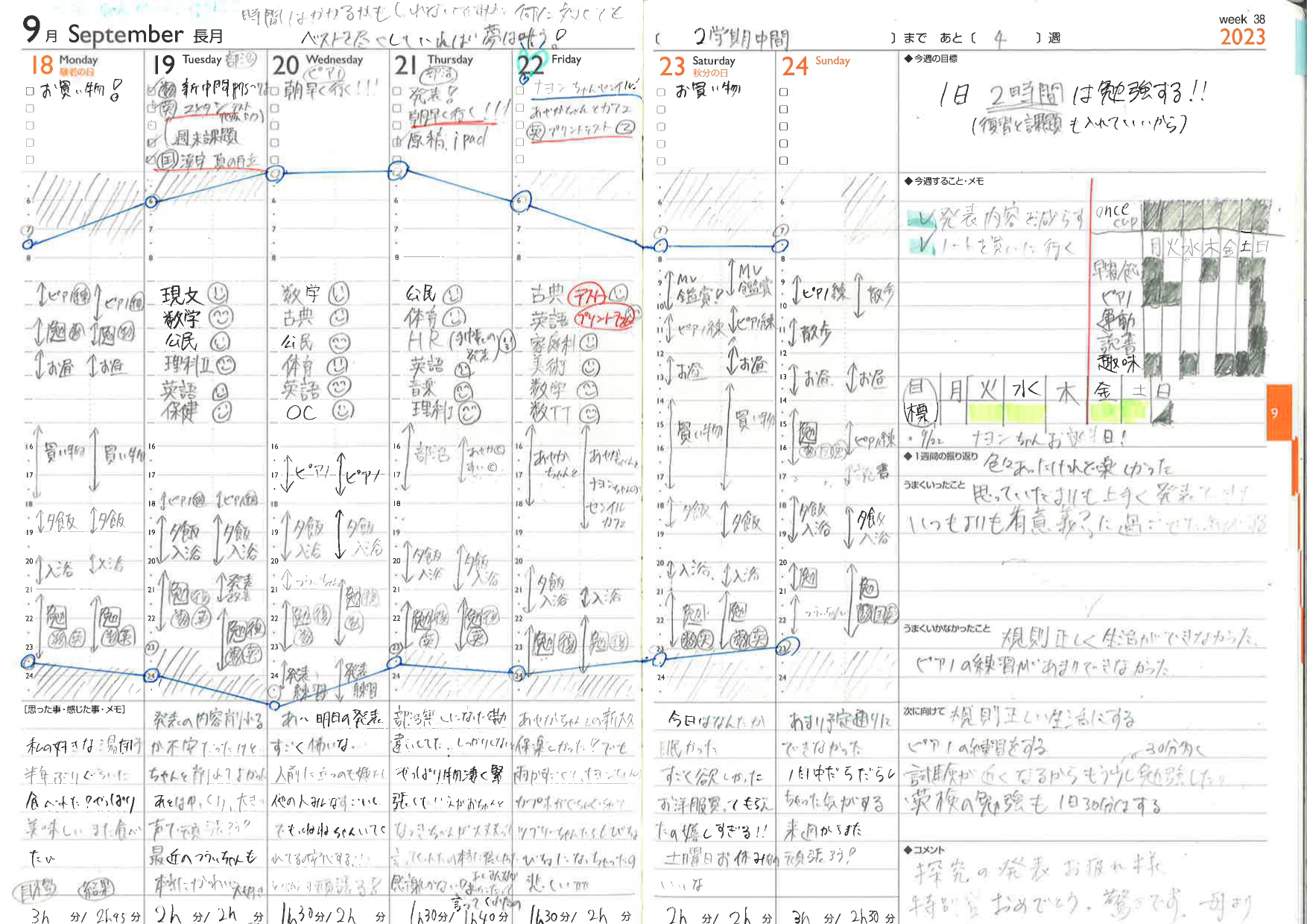 Tさん:手帳を書く前は一日の勉強時間がルーズになっていましたが、手帳をつけはじめて、自分が立てた予定どおりに勉強を行うことができるようになりました。また余った時間は他の勉強時間にあてることができるようになったので、成績が上がりました。プライベートの予定も先の見通しが分かっているので、今のうちにやっておいたほうがいいことなど、自分で判断ができるようになり、気持ちの面でも余裕ができるようになりました。