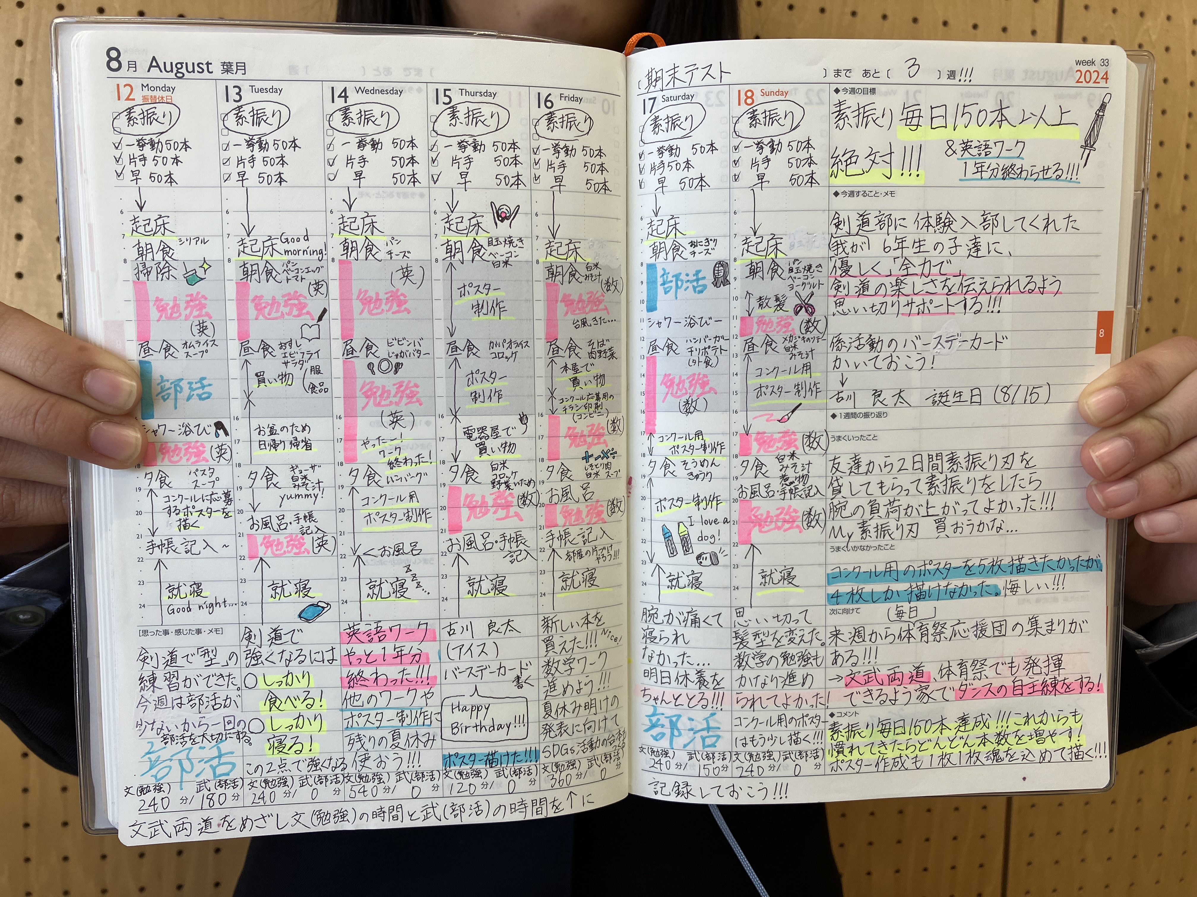 きっかけは学校からの案内です。手帳甲子園の手帳部門には、ある夏休みの1週間の手帳紙面を提出しました。それまではあまりスコラ手帳を活用できていなかったのですが、夏休みは学校がないため、勉強時間の管理を自分でしなければなりません。そこで手帳を活用して学習管理をしようと思い立ち、夏休みから本格的に使い始めました。また部活の時間が生活の中心になるので、部活で指示されたメニューを忘れないように手帳に書き込んでいました。振り返る時も自分の頑張りを確認できますし、日常のタスクを忘れないためにも活用できると感じました。